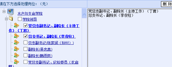 (5)点击学院领导,同时选取“党总支副书记、副院长(主持工作)(丁君)”和“党总支书记、副院长(李俊柱)”;