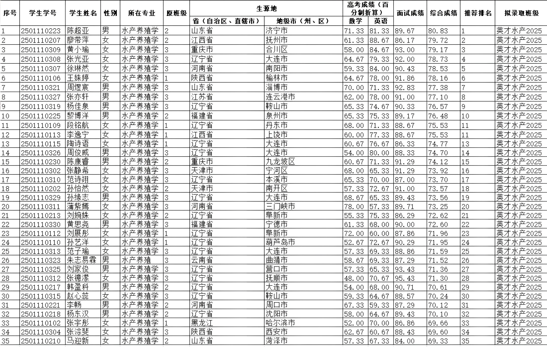 根据《关于开展2025级蓝色英才班学生选拔工作的通知》要求,现对我院2025级蓝色英才班选拔结果予以公示,公示期3天,如有异议,请与学院联系。联系人:叶仕根、徐玥
